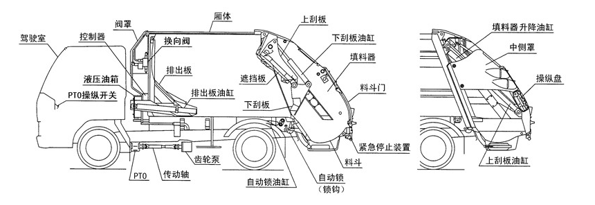 3、填充器——6-10方小型压缩式垃圾车填充器容积0.7-0.8方,12-20方大型大型压缩垃圾车填充器容积为:1.5-1.8方。