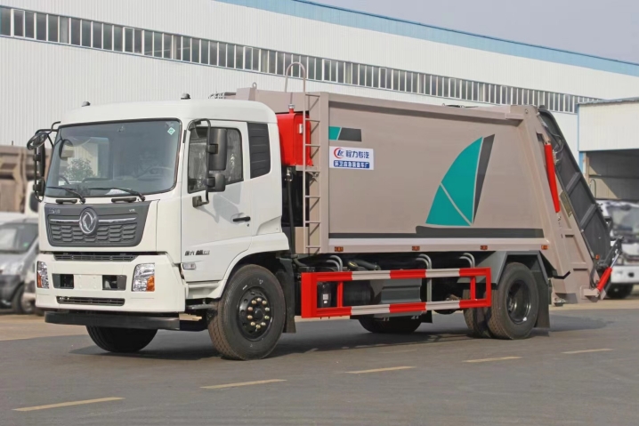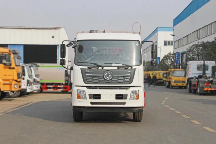 东风天锦大型18立方压缩垃圾车上装配置:弧形箱体(带边梁),容积约14立方,采用特种钢板制作,箱体底板5,边板±mm,中联配套液压缸,江苏多路阀,长源液压油泵,填装器举升油缸带液压锁装置,采用西门子PLC电控系统,带电动操作和手动操作两种模式,电控操作盒3个,分别安装在驾驶室内及车尾部左右各一只,后填充器下部一只污水箱(与填充器焊为整体),底盘大梁一侧一只污水箱,填充器上方标配工作灯一只。(选装其他类型翻转架)