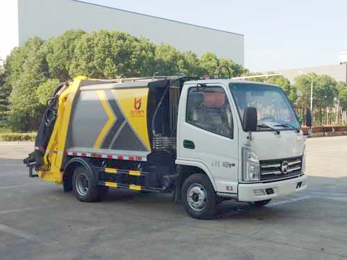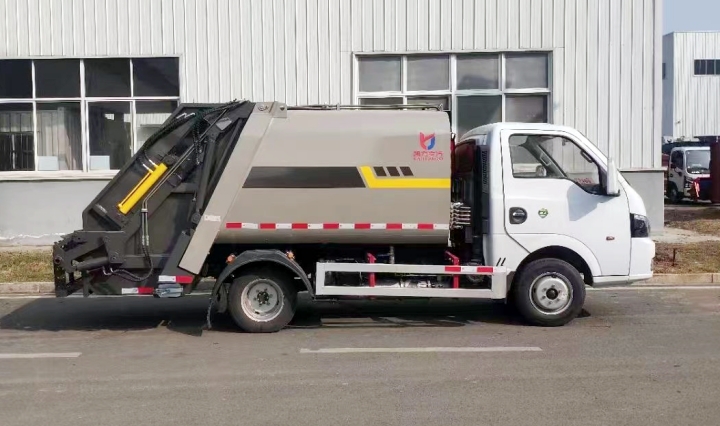 3.小型压缩式垃圾车;采用机电液一体化技术,借助机、电、液联合自动控制系统,通过车厢、填装器和推铲等专用装置,实现垃圾倒入、压碎或压扁、强力装填,把垃圾挤入车厢并压实和推卸。其主要特点是垃圾收集方式简便、高效、具有自动反复压缩以及蠕动压缩功能,压缩比高,装载质量大,作业自动化,动力性、环保性好,整车利用效率高。广泛的运用就是对垃圾回收站内的垃圾进行批量运输,将垃圾运送至指定的垃圾处理地点。